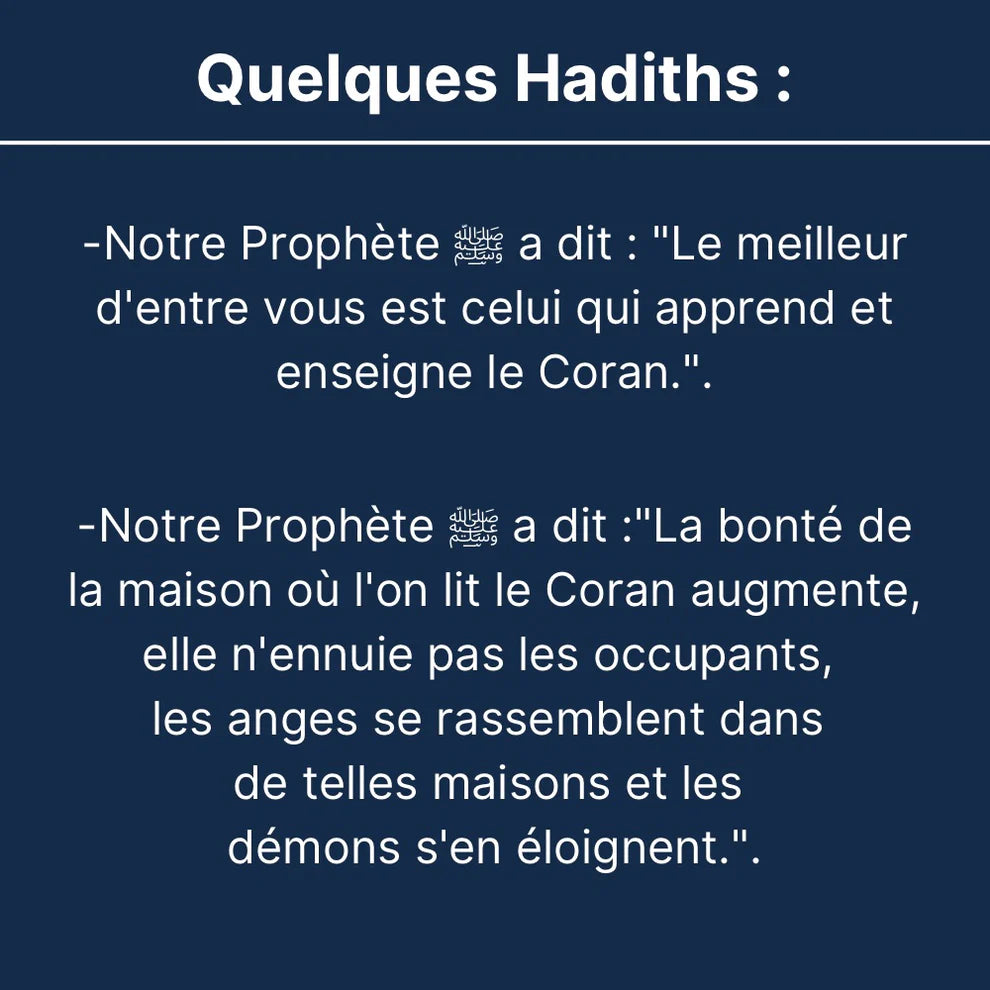 “Conçue pour toute la famille – Favorisez l’apprentissage du Coran chez les enfants, partagez des moments de récitation avec vos proches et instaurez une atmosphère sereine et spirituelle à la maison.